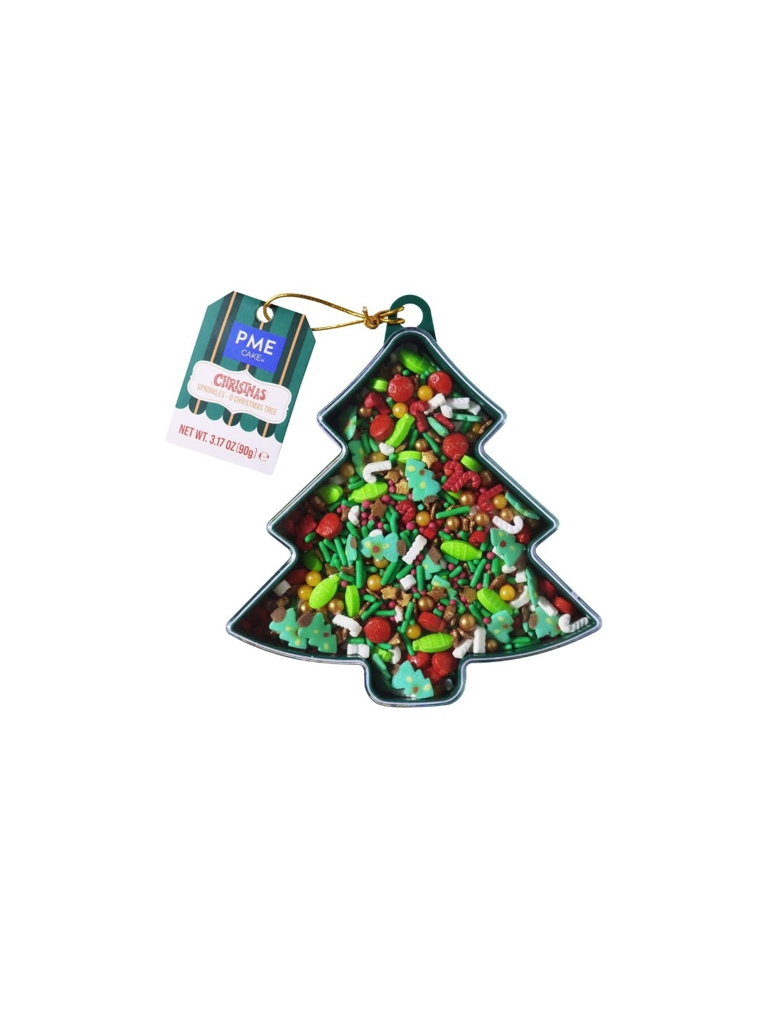 90g de sprinkles con un tema en rojo, verde y dorado, que incluye una mezcla de confeti de estrellas, rodajas de fondant en forma de árbol, perlas y más.Viene en una encantadora caja reutilizable en forma de árbol de Navidad con diseño de adornos. ¡Perfecto para regalos navideños!Ideal para helados o para decorar donas, postres, cupcakes y más.