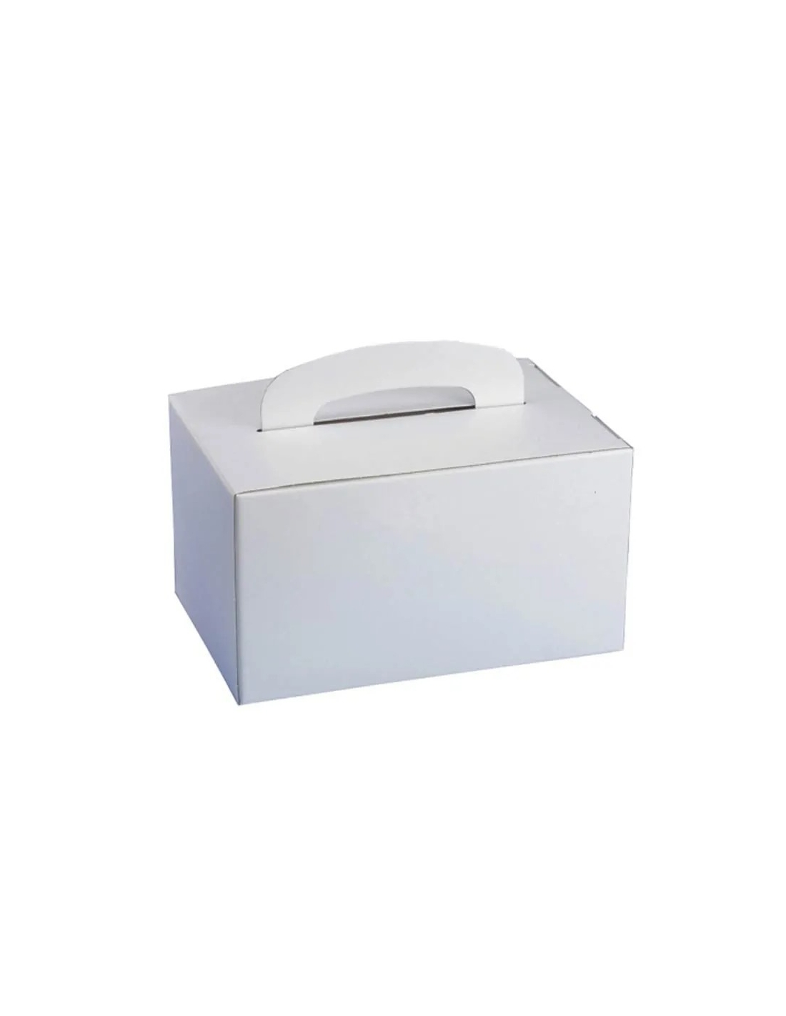Caja de cartón para postre o brazo de gitano individual. Blanca con asa. Medidas: 18x9 cm.