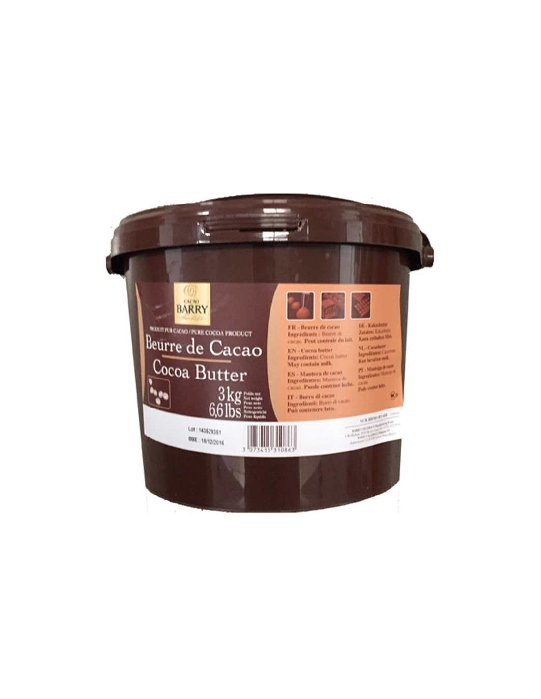 La manteca de cacao de Callebaut es el resultado de prensar una cuidada selección de habas de cacao tostadas enteras. Tiene una pureza del 100% y presenta un sabor y un color neutros.Constituye una base magnífica para hacer mezclas de colores aplicándolo con pistola de aerografía.Es también un ingrediente muy bueno para adaptar la fluidez del chocolate. Si añade entre un 1% y un 8% de manteca de cacao al volumen total de chocolate, lo ablanda, lo que resulta ideal para moldeados y recubrimientos finos o muy finos.Además, hará que el chocolate quede más brillante y crujiente en aplicaciones de confitería moldeada y recubierta.La manteca de cacao Callebaut es muy fácil de trabajar y viene en gotas (Callets), para facilitar la dosificación.Envase: cubo de 3 kg.