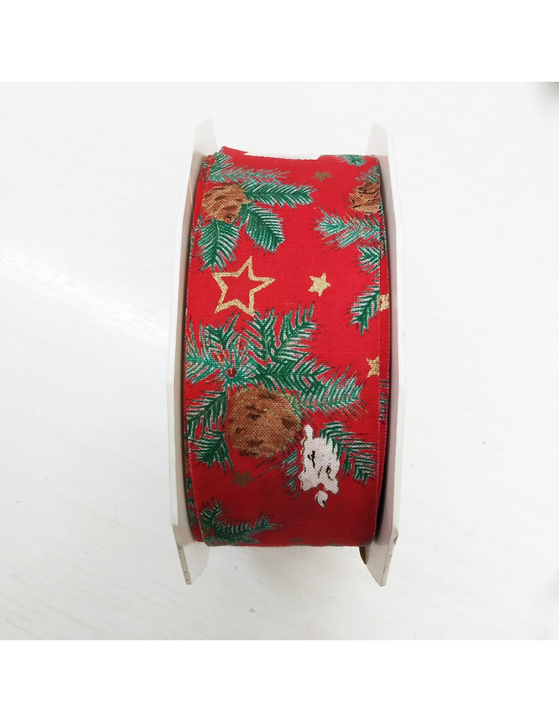 Cinta de tela en color rojo con dibujo de piñas con muerdago en color verde Medida: 4cm x 25mts