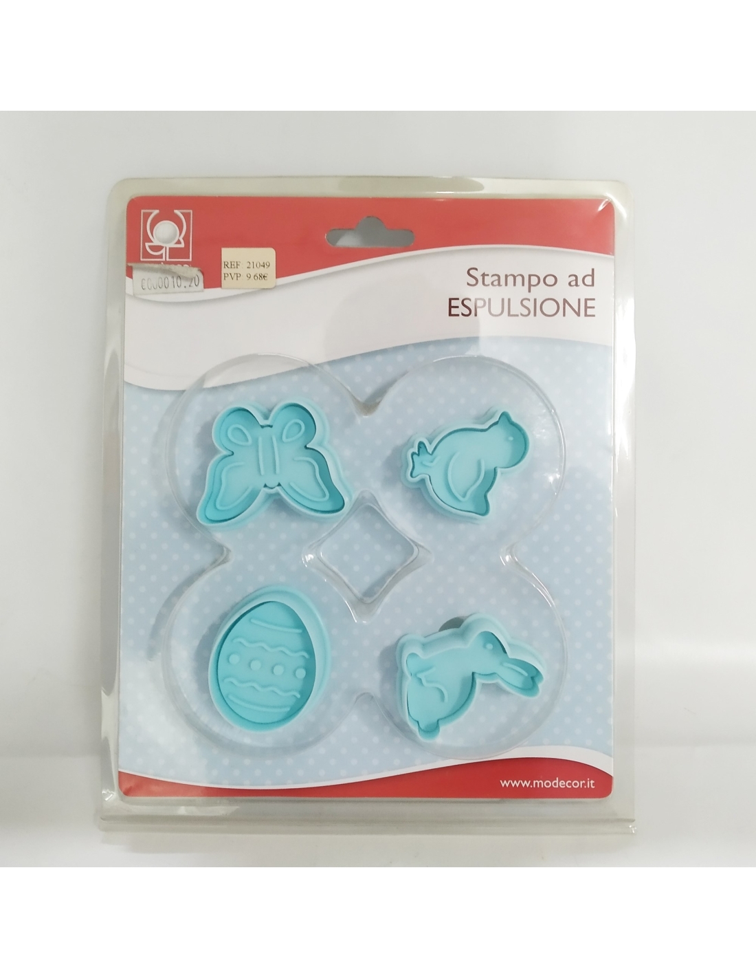 Conjunto de 4 moldes de expulsión de Pascua. El juego incluye 4 moldes de expulsión para hacer lindas galletas de Pascua. Con el mismo, además de cortar la masa de forma perfecta, también es posible imprimir en ella para facilitar la decoración con Fondant o Glaseado Real. Dimensiones: l3 / 5xh4 / 5 cm.
