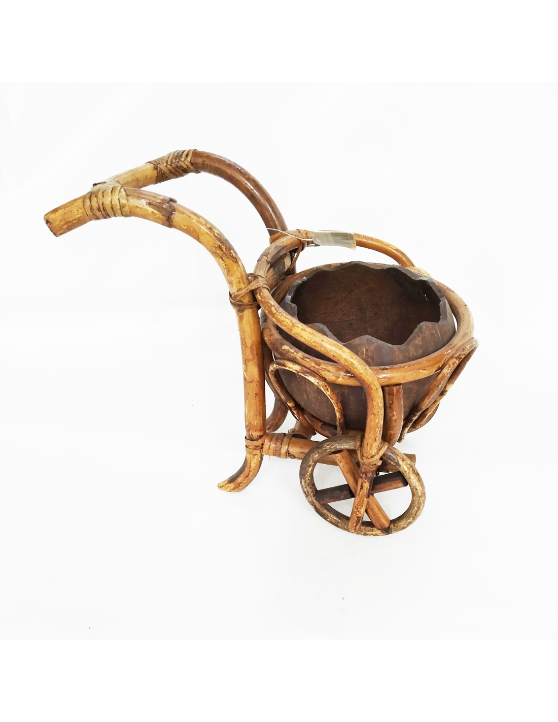 Carrito de caña y en el centro es un coco con unas bonitas formas onduladas. Perfecto para poner una botella, una planta o cualquier otro detalle. Medidas 29x25x18