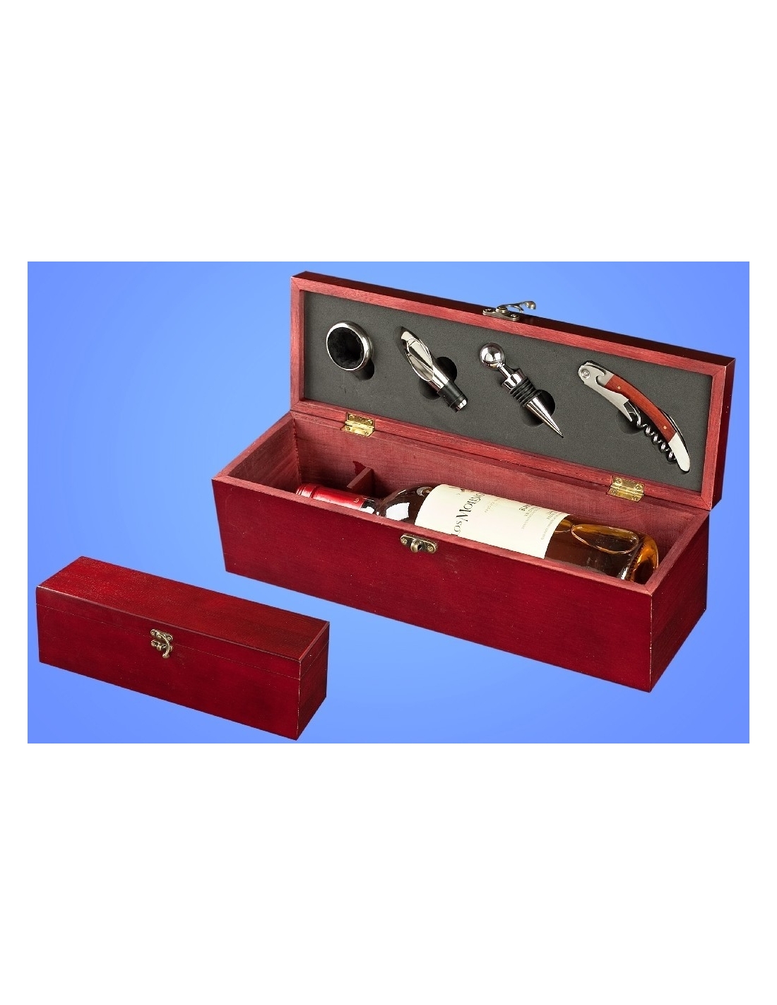Precioso botellero en caja de madera forrado en su interior en el cual también incluyen accesorios destinados al vino. Medidas 11x36x12