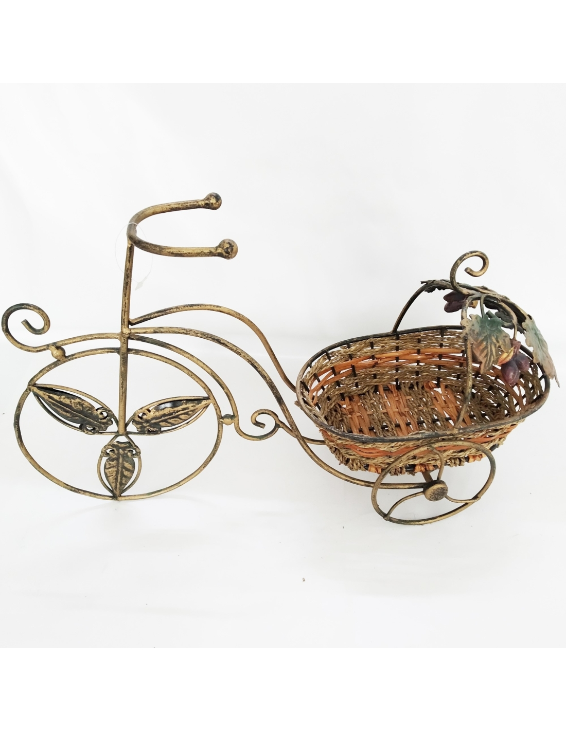 Triciclo en hierro tonos dorados y negros con detalles de racimos de uvas y el asiento es un cesto de mimbre, perfecto para cualquier rincón de la casa a modo de decoración, de jardinera para una planta, etc... Medidas 50x30x17