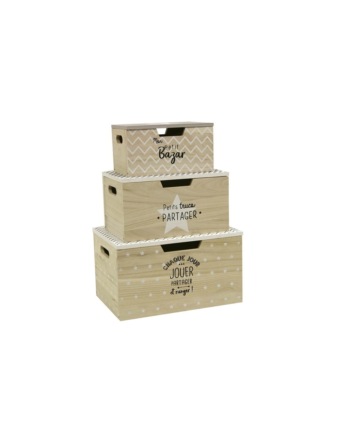 Estas cajas están hechas en madera natural de muy buena calidad, por eso, tienen estupendos acabados. Los producto cuenta con una cubierta abatible, de madera blanca con diferentes estampados, que permite abrir y cerrar como si se tratatra de un baúl. El diseño de la caja se centra en el estilo tradicional, con inscripciones en tono negro con decoraciones alrededor del cuerpo de las cajas. Estos productos están pensados para el almacenaje y la decoración de cualquier estancia de nuestra vivienda, principalmente para que los más pequeños de la casa guarden su juguetes.