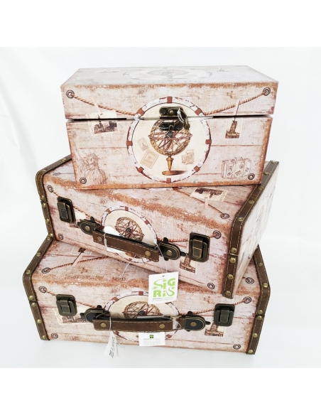 Cofre con estampación de sellos e imágenes. Forro en el interior. 24,5x12x14