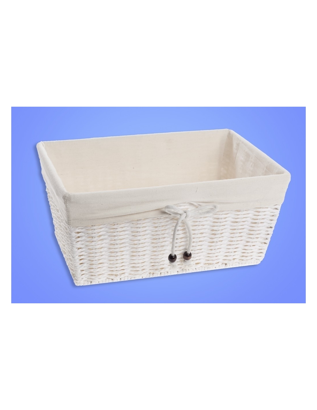 Bonito cesto pongotodo de cuerda blanca con su forro con tela de saco y dos bolas de madera como decoración. Muy útil para poner bollería, pan, ropa, colada limpia, etc... Medidas 34x24x15