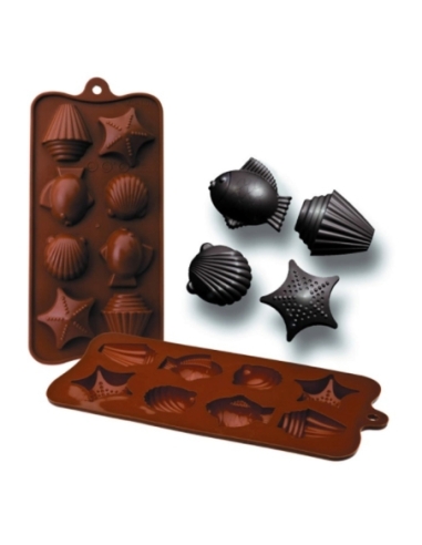 Molde con formas marinas varias para hacer bombones o similar. Tiene 8 cavidades. Fabricado en silicona, el molde podría usarse tanto en horno convencional como microondas. Puede congelarse y lavarse en el lavavajillas.