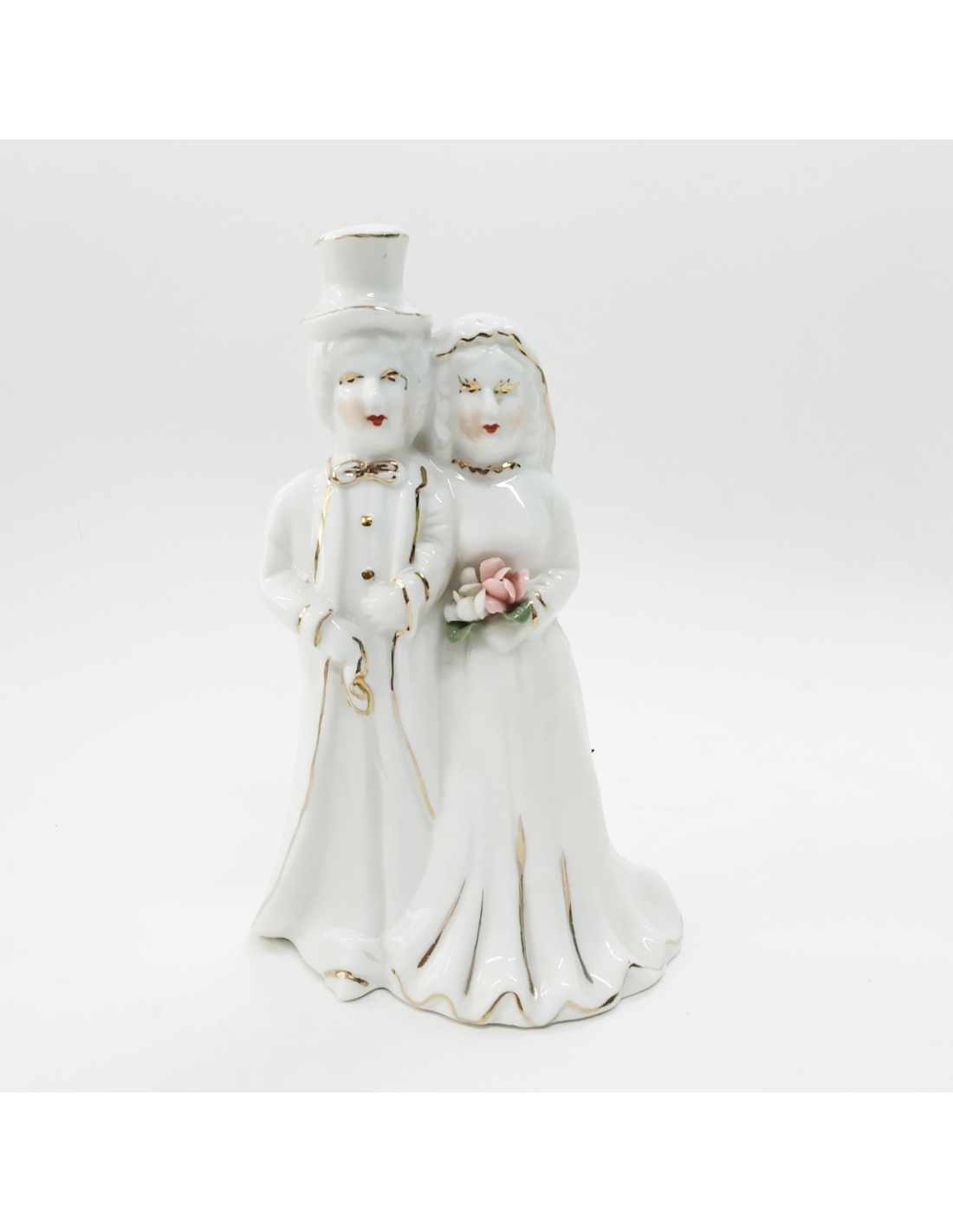 PAREJA NOVIOS PORCELANA SOMBRERO Y RAMO FLORES