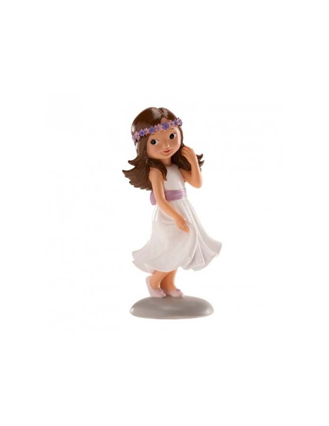 Bonita figura de niña de comunión castaña con pelo largo, vestido con vuelo y lazo y diadema en tonos lilas