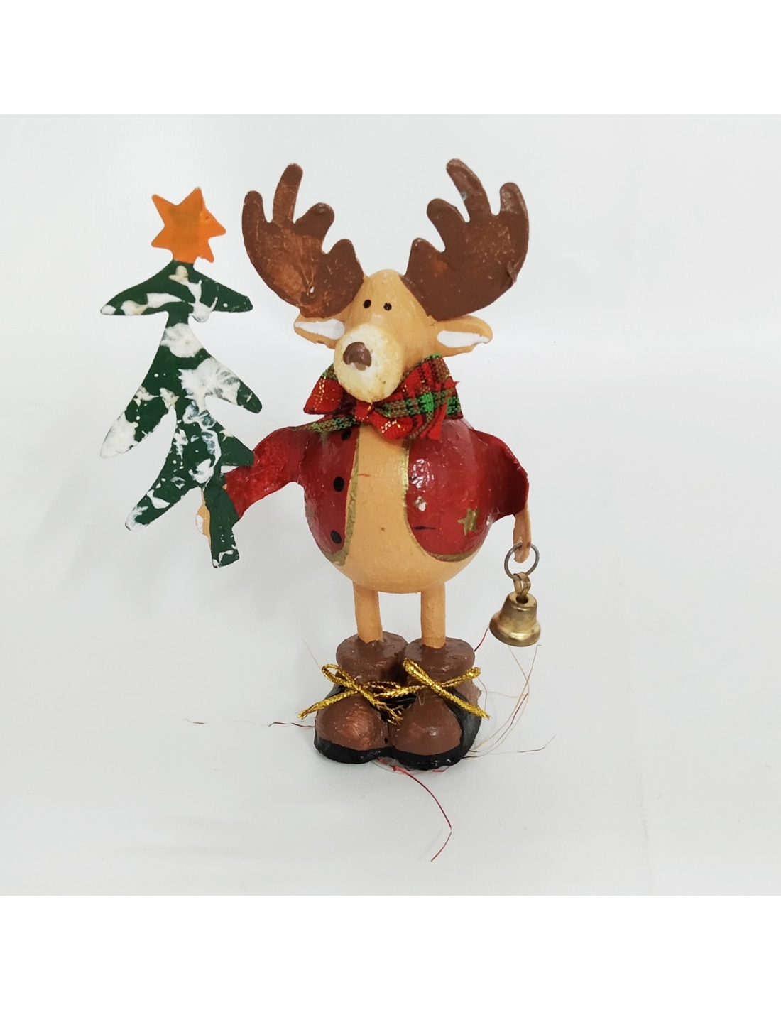 Divertido reno de hojalta, vestido con su chaqueta roja, pajarita y acompañado de una campana y un abeto. Medidas 10 cm