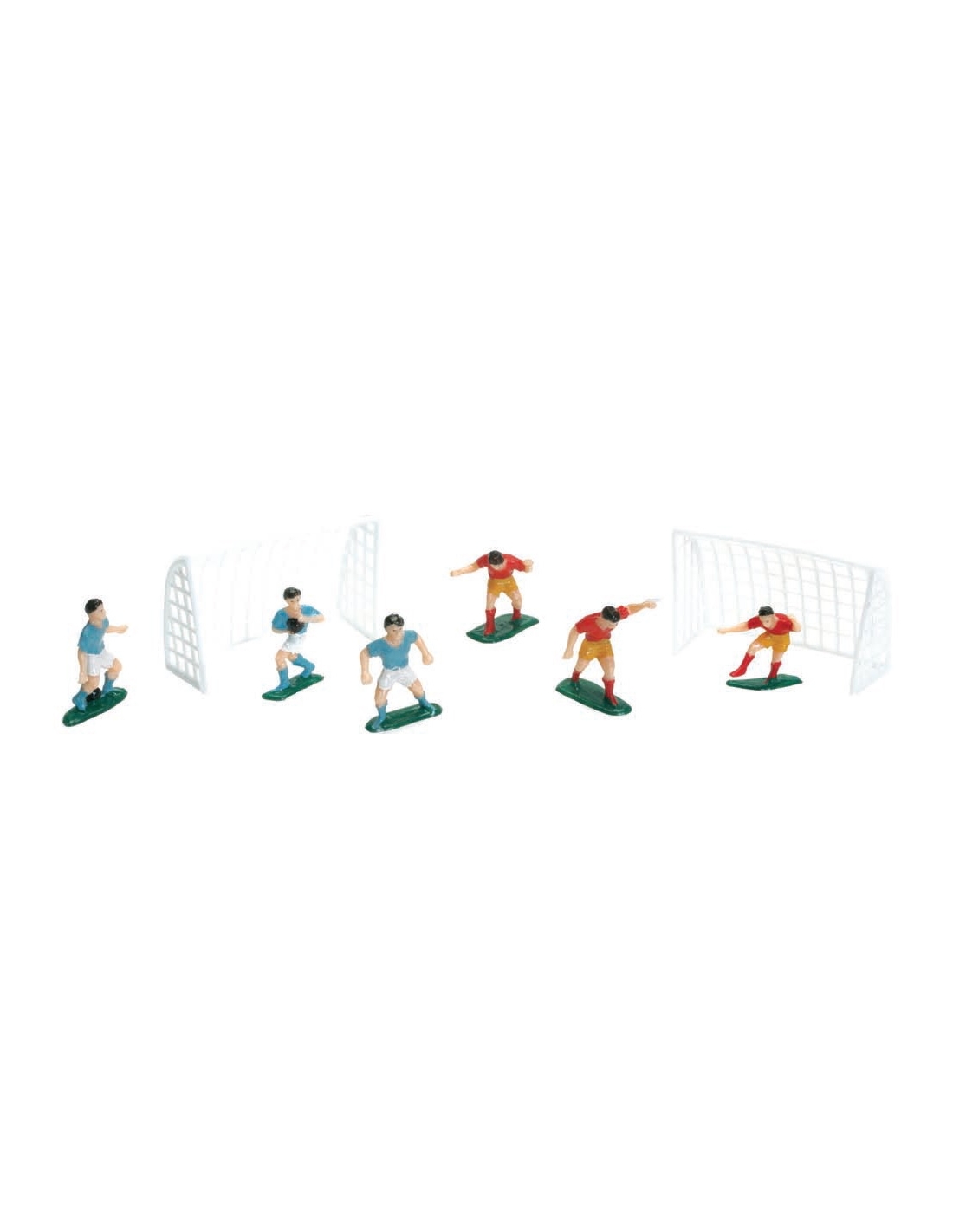 Set de decoración de fútbolEste set de fútbol es ideal para decorar las tartas de los apasionados por el deporte.Medidas futbolistas: Aprox. 6 cm de alto.Medida de las porterías: 10 cm de ancho x 8,9 cm de alto x 3,5 cm de profundidad parte más ancha.Fabricadas en plástico de primera calidad, resistente y seguro. Decoración no comestible
