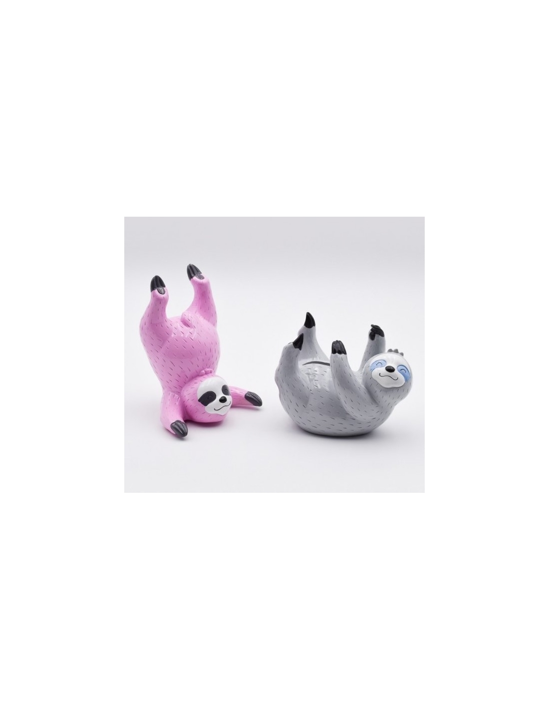 Hucha decorativa perezoso en dos posiciones. Figura de cerámica pintada a mano. Colores: rosa y gris. Medida 15,5 cms. Elegir el modelo deseado