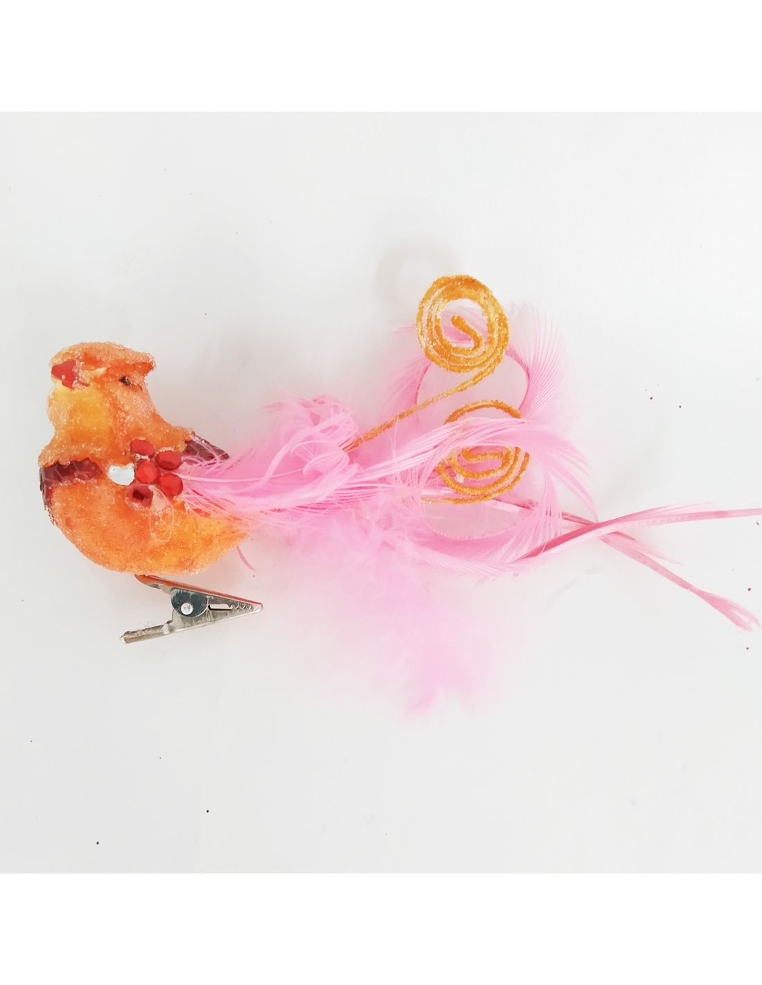 Pájaro con pinza de color naranja y plumas rosa para decorar cualquier rincón. Medidas 10x6 cm