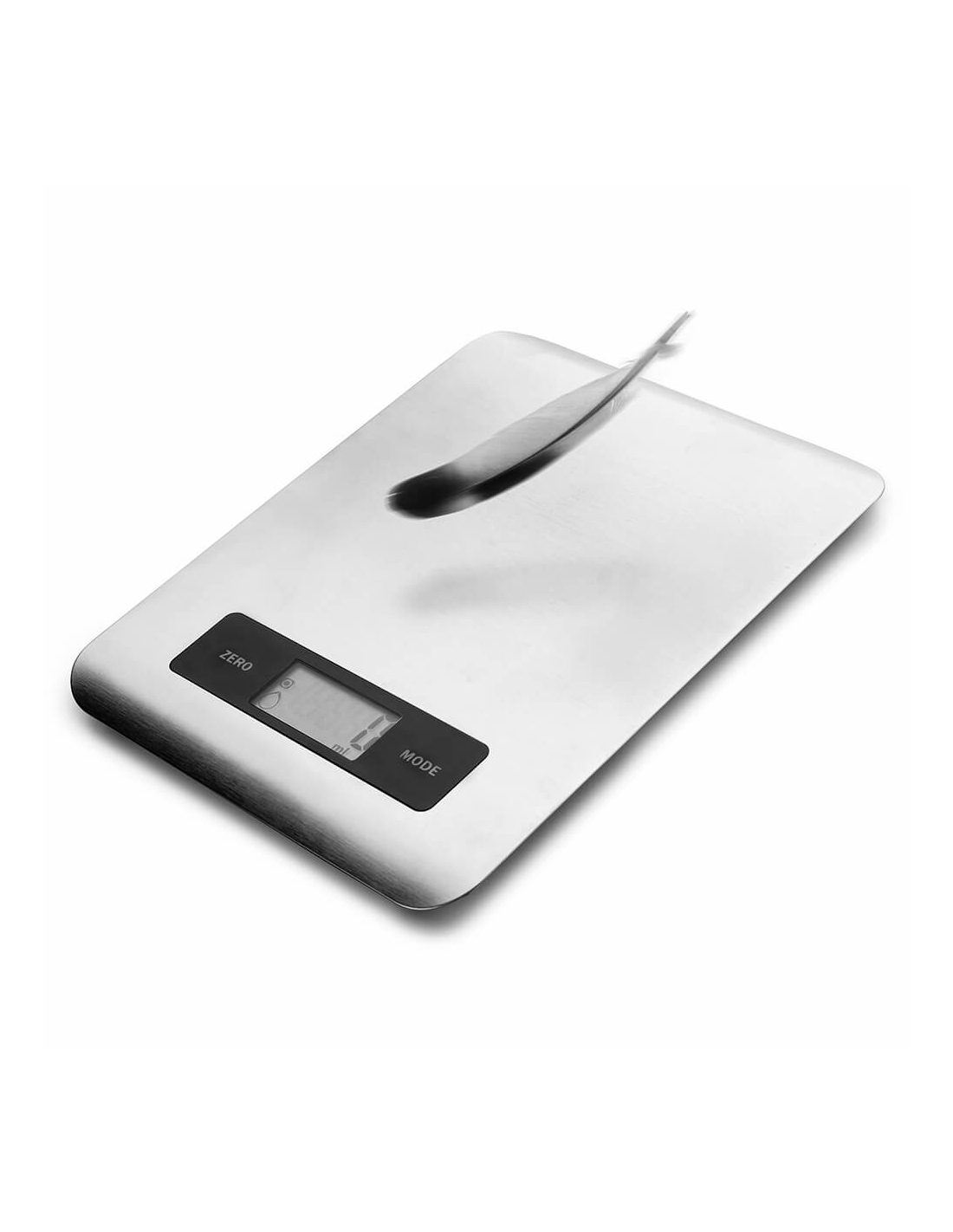 Báscula digital superfinaMaterial : InoxBáscula electrónica numérica superfina para cocina, con plataforma de acero inoxidable.Calibrado automático y lectura inicial a cero. Apagado automático. Indicador de volumen.Dimensiones : 21,5 x 17 cmCapacidad max. : 5kg/11 lb. División graduación : 1 g/0,1 ozDimensiones LCD : 45 x 21 mm