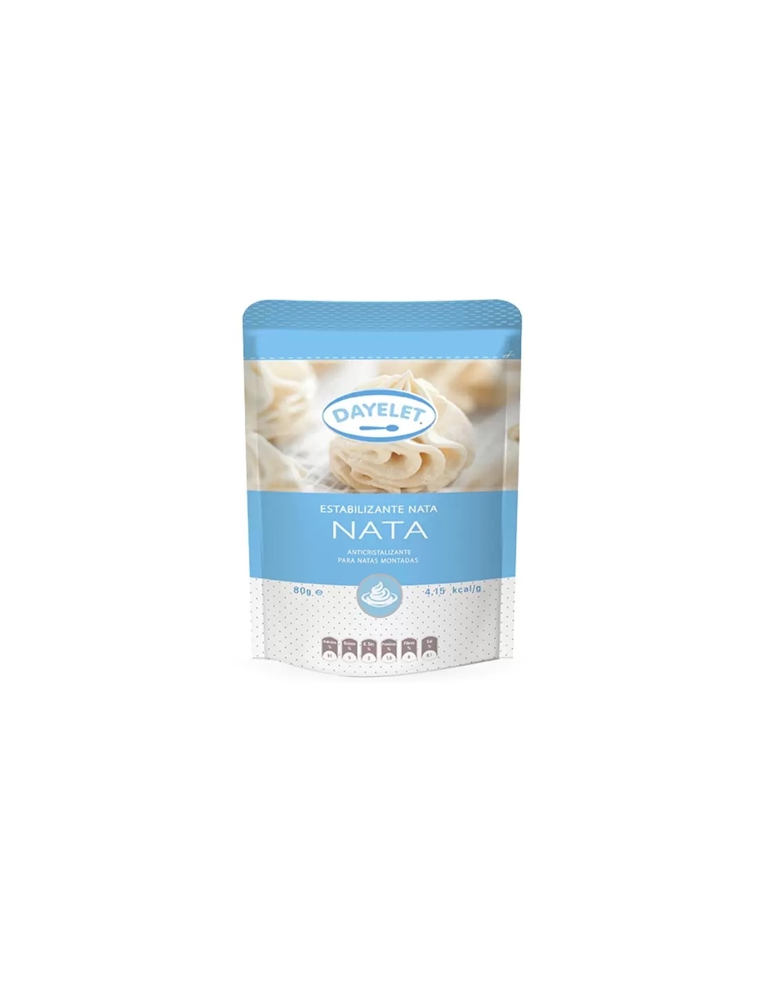 Aporta estabilidad y firmeza a la nata, regula su textura y cremosidad sin dar gomosidad alguna.Estabilizante perfecto para congelar y descongelar todas las recetas que contengan nata ya que actúa como anticristalizante.En muchas recetas puede reducir o sustituir la cantidad de gelatina empleada. Su empleo puede ampliarse a todo tipo de recetas que contengan natas como: rellenos, trufas, mousses , cremas inglesas, cremas heladas, cupcakes o para envasado en copas de postre. Por litro de nata, mezclar en seco de 30 a 40 gramos de estabilizador DAYELET NATA con 100/200 gramos de azúcar. Esparcir esta mezcla sobre la nata cuando ésta empieza a montar. Evita las pérdidas de suero y su cristalización en la nevera o en el congelador. Éste producto es sin gluten, sin huevo, sin fructosa, sin azúcar, sin frutos secos, sin soja. Contiene lactosa. Envase: bolsa de 80 gr.