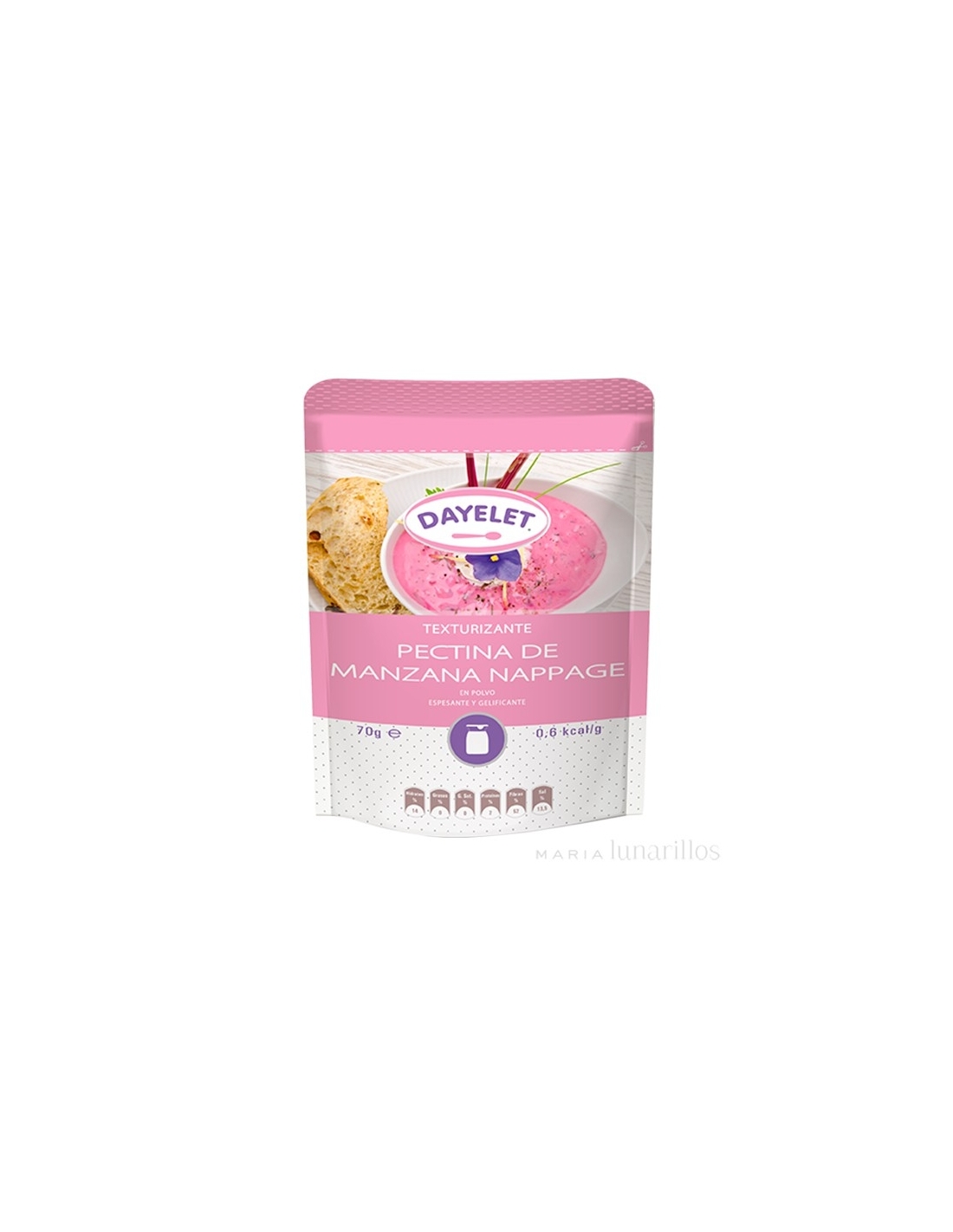 Las pectinas son polisacáridos naturales que se encuentran en las paredes de las células vegetales.A partir de la industrialización de la pulpa de cítricos y manzanas, se obtienen la mayoría de las pectinas, que se presentan en forma de polvo color marrón. Sus dosis generales de uso tienen en el agua fría un máximo del 3%, y en agua caliente del 6 % al 8%. Para dispersar la DAYELET PECTINA DE MANZANA NAPPAGE en agua fría, mezclarla primero en seco con los demás ingredientes y verter sobre el líquido con agitación de túrmix. También puede dispersarse en aceite, licores o jarabes espesos de azúcar (+ de 65º brix). Si la queremos disolver mejor, podemos calentar hasta 80º-85º C. Siempre es una dificultad si nos encontramos con “aguas duras” que requerirán más tiempo de cocción.La gelificación de la pectina con interacción del calcio (lácteos), se produce durante el enfriamiento. Unos 3 g de pectinas se corresponden a 1 lámina de gelatina. La textura definitiva se obtiene des